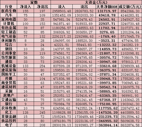 從資金層面看,今日A股大單資金整體凈流出158.3億元,其中,有1395只個股凈流入,2623只個股凈流出。從申萬一級的28個行業(yè)來看,有6個行業(yè)呈現(xiàn)大單資金凈流入態(tài)勢,其中,醫(yī)藥生物行業(yè),資金凈流入為13.17億元,位居首位。緊隨其后的是汽車、家用電器、計算機、有色金屬等四行業(yè)資金凈流入均超1億元。另外,電子、食品飲料、非銀金融、化工等四行業(yè)資金凈流出居前,均超10億元。