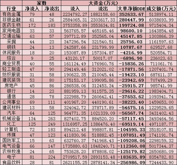 從資金層面看,今日A股大單資金整體凈流出44.35億元,其中,有1490只個股凈流入,2573只個股凈流出。從申萬一級的28個行業(yè)來看,有7個行業(yè)呈現(xiàn)大單資金凈流入態(tài)勢,其中,有色金屬、非銀金融、醫(yī)藥生物等三行業(yè),資金凈流入均超10億元,分別為35.26億元、28.04億元和19.97億元,合計83.27億元。緊隨其后的是家用電器、交通運輸、采掘、鋼鐵等四行業(yè),資金均呈現(xiàn)凈流入態(tài)勢。另外,食品飲料、電子、農(nóng)林牧漁、電氣設備、國防軍工、傳媒、計算機等行業(yè)資金凈流出均超10億元。