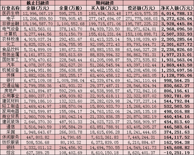 從行業(yè)方面看,今年以來,在申萬一級的28個行業(yè)中,除綜合行業(yè)以外,其他27個行業(yè)被融資客凈買入,其中,醫(yī)藥生物和電子等兩大行業(yè)凈買入額均超500億元,分別為601.48億元和527.26億元,合計達1128.74億元。緊隨其后的是非銀金融、電氣設備、計算機、農林牧漁、化工、食品飲料等六行業(yè),融資凈買入額均超200億元,分別為392.84億元、296.81億元、250.73億元、230.53億元、230.16億元和223.68億元。