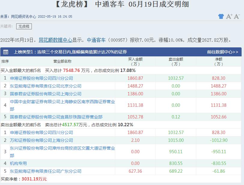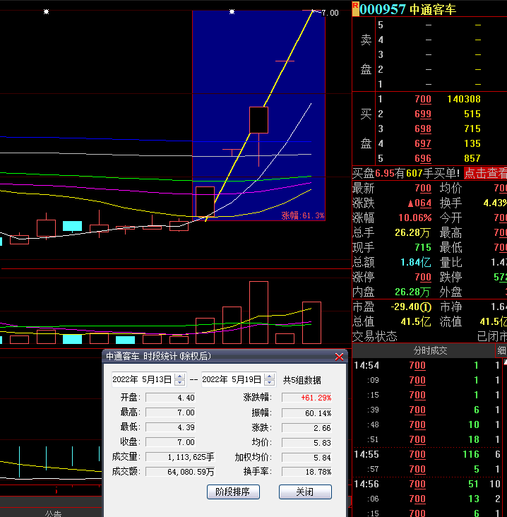 5月19日,中通客車再度漲停,截至收盤,報7.00元,連續(xù)5日漲停,期間累計漲達61.29%。