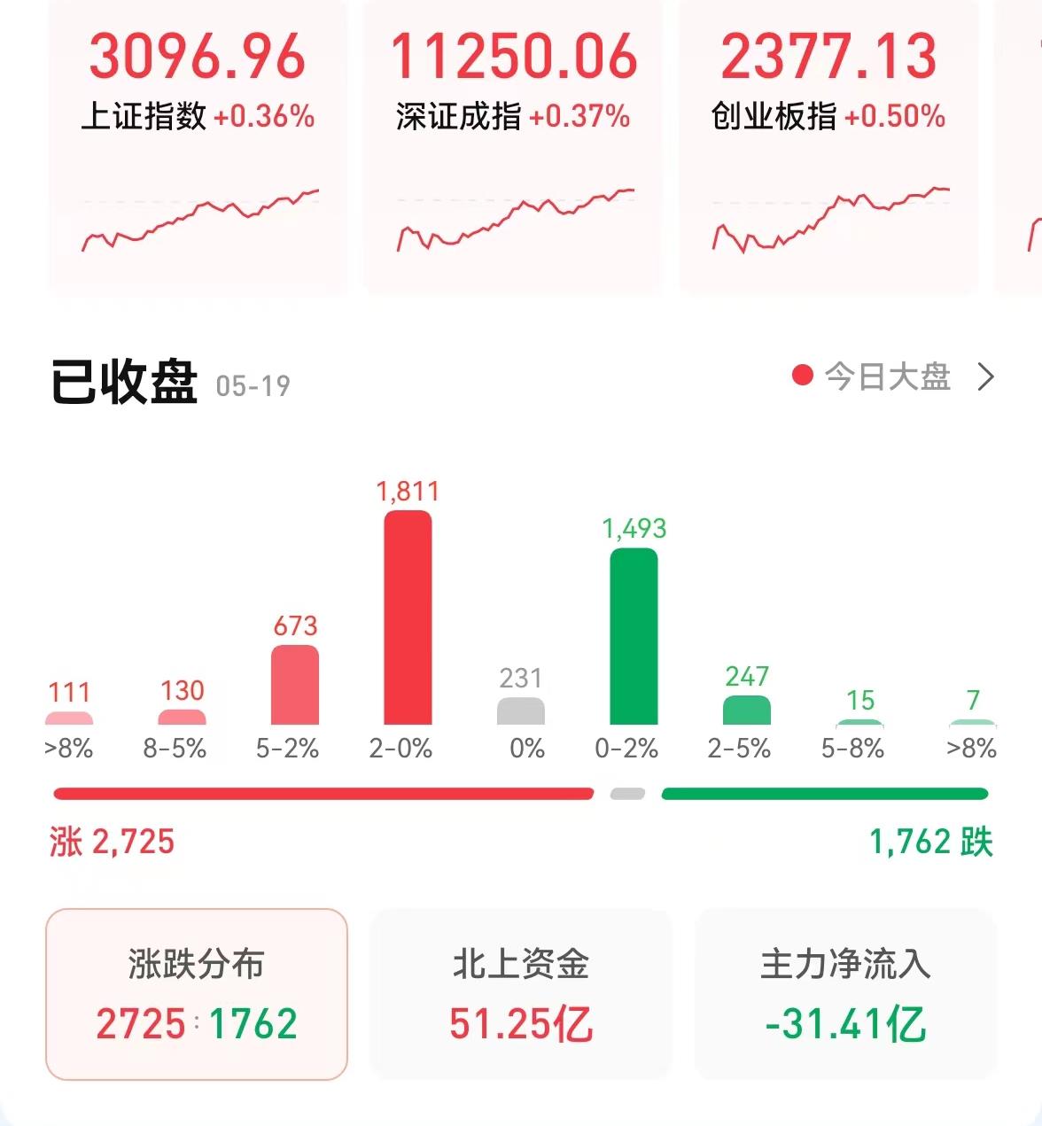 5月19日,三大股指低開高走,集體飄紅,截至收盤,上證指數(shù)漲0.36%報3096.96點,深證成指漲0.37%報11250.06點,創(chuàng)業(yè)板指漲0.5%報2377.13點;兩市合計成交8067.1億元,北向資金凈買入51.25億元??傮w來看,兩市個股漲多跌少。