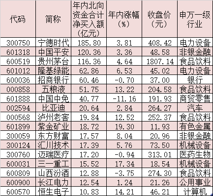 具體來看,寧德時代、中國平安、貴州茅臺等3只個股年內(nèi)累計北向資金凈買入額均超百億元,分別達到185.80億元、120.36億元和116.36億元,隆基綠能、招商銀行、五糧液、中國中免、比亞迪等5只個股年內(nèi)均受到20億元以上北向資金布局。