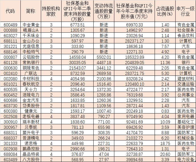 值得關注的是,今年二季度,有76家A股上市公司的前十大流通股股東中同時出現(xiàn)社?;鸺癚FII身影,合計持股市值達561.26億元。其中,26家公司今年二季度獲社?;鸷蚎FII等長線資金集體加倉,峨眉山A、光庭信息、中金黃金、千禾味業(yè)、金山辦公、中船特氣等6家公司期間獲社?;鸷蚎FII集體增持。此外,有20家公司期間獲社?;鸷蚎FII繼續(xù)加倉,包括云鋁股份、常熟銀行、銅陵有色、廣聯(lián)達、中材科技、春秋航空、天士力、涪陵電力等在內(nèi)的11家公司期間社?;鸷蚎FII累計增持數(shù)量均超1000萬股。