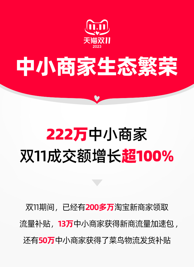雙11期間,200多萬淘寶新商家領(lǐng)取了流量補(bǔ)貼,13萬中小商家獲得了新商流量加速包,菜鳥物流補(bǔ)貼也覆蓋了50萬淘寶中小商家。