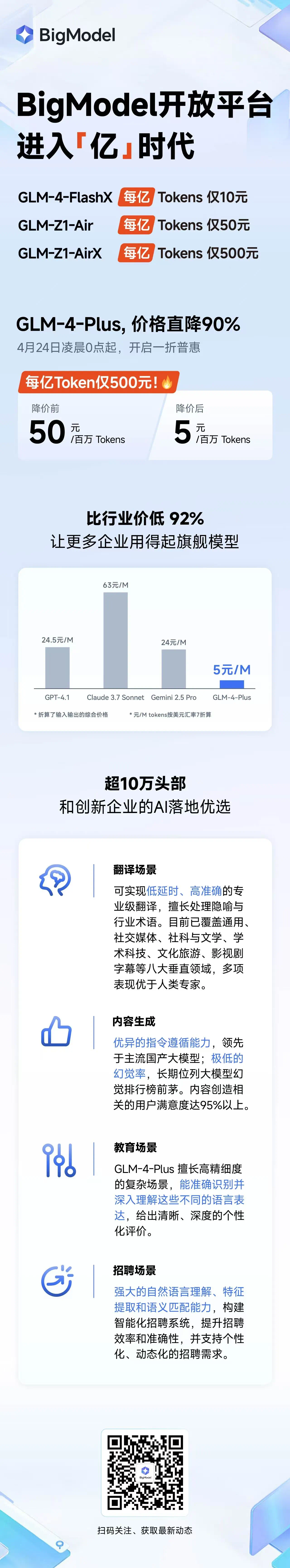 4月24日,北京智譜華章科技股份有限公司(以下簡稱“智譜”)宣布對旗下多款大模型產(chǎn)品進行價格調整,智譜BigModel開放平臺率先進入“億”時代,即模型以“每億tokens”為單位計價,大幅降低使用門檻,讓更多的企業(yè)能夠以極低成本擁抱大模型技術。