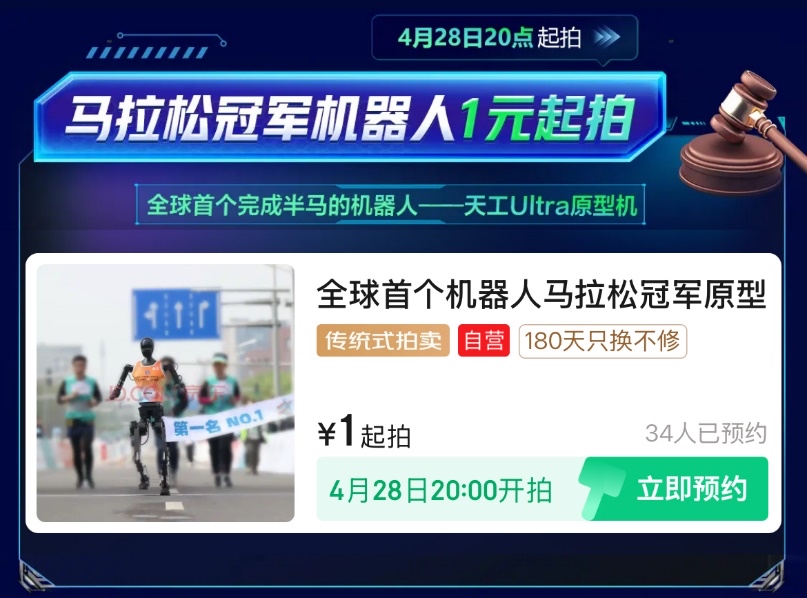 此次拍賣的成功,不僅彰顯了京東拍賣在高科技產(chǎn)品拍賣領(lǐng)域的敏銳洞察力和高效執(zhí)行力,更預(yù)示著京東拍賣在推動(dòng)科技產(chǎn)品流通、促進(jìn)科技創(chuàng)新發(fā)展方面的獨(dú)特優(yōu)勢和深遠(yuǎn)影響。而在這場拍賣余熱未消之際,京東拍賣再次發(fā)布重磅消息——將于4月28日拍賣同場競賽的冠軍“天工”人形機(jī)器人。