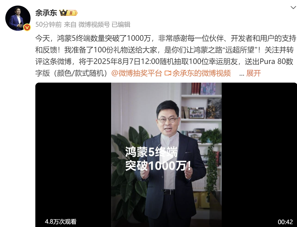 7月30日,華為常務(wù)董事、終端BG董事長(zhǎng)余承東亦在微博發(fā)文稱,今天,鴻蒙5終端數(shù)量突破1000萬(wàn)。